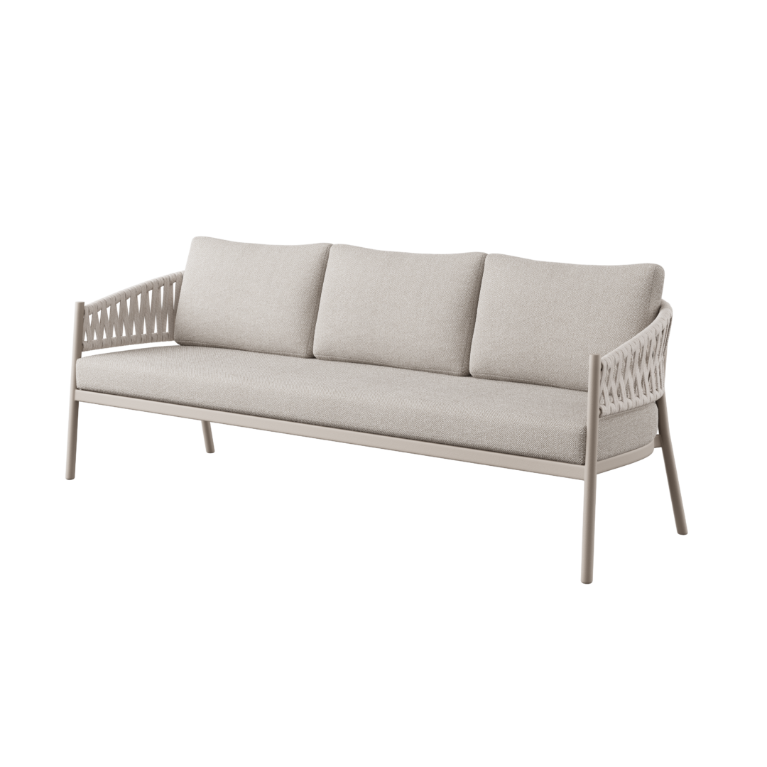 ספה תלת מושבית בעיצוב ייחודי, עשויה שלדת אלומיניום איכותית בחיפוי חבלי פוליאסטר עבים. שלדה בצבע מוקה, ריפודים וחבלים בצבע אבן. *צפי אספקה: אמצע ינואר