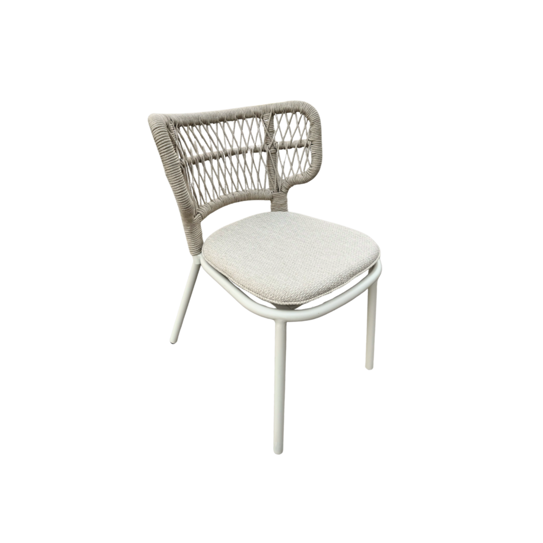 כסא אוכל עשוי שלדת אלומיניום איכותית בגוון אבן עם גב חבלים קלוע בשיטת אריגה ייחודית. הכסא כולל ריפוד מושב עם בד אולפיין איכותי, חבלים בגוון מוקה בהיר