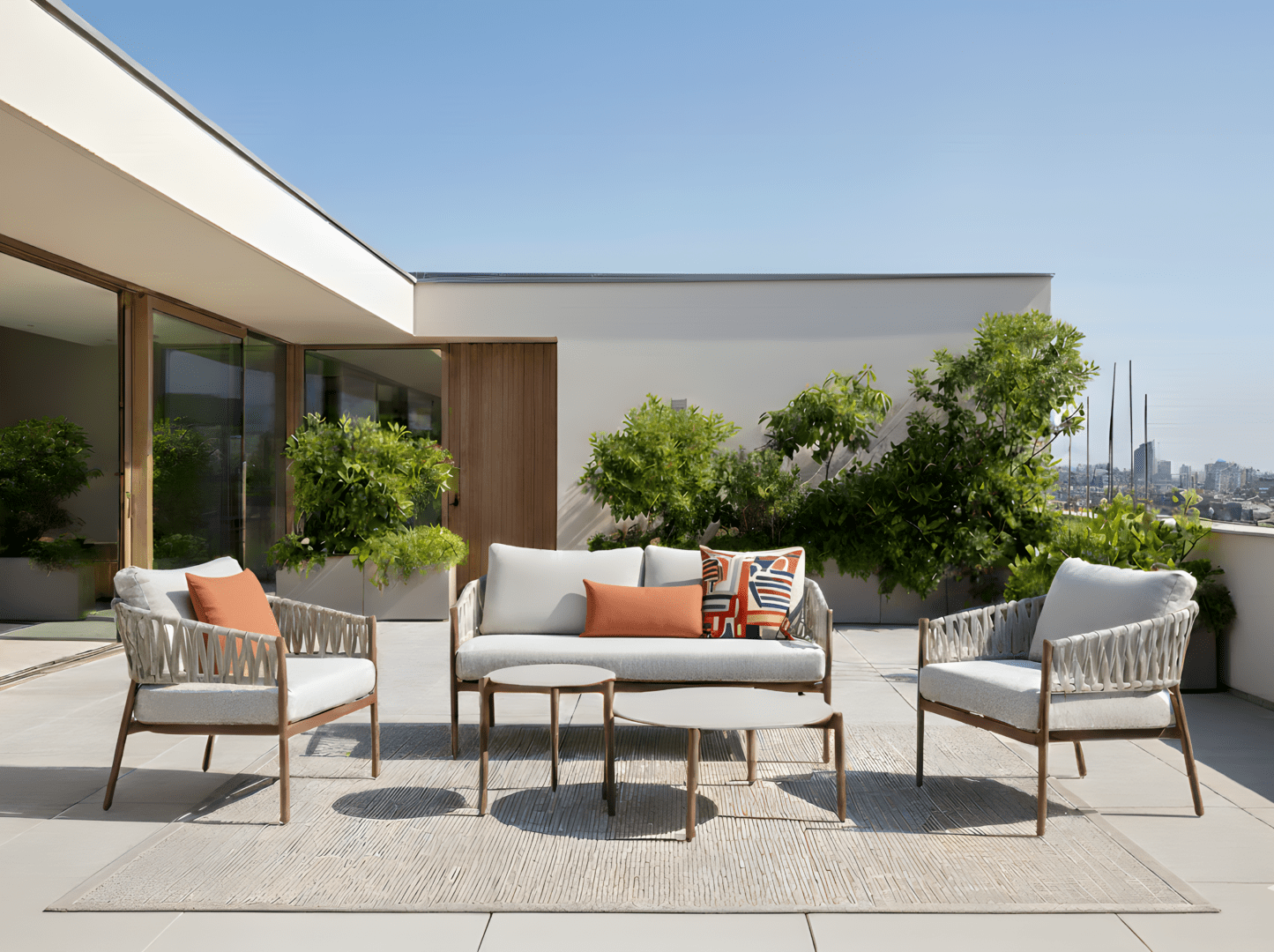 פינת ישיבה בעיצוב ייחודי, עשויה שלדת אלומיניום איכותית בחיפוי חבלי פוליאסטר עבים. המערכת כוללת ספה דו מושבית, 2 כורסאות בודדות, ו-2 שולחנות קפה עגולים בגדלים שונים עם פלטת קרמיקה. שלדה בצבע טרקוטה, חבלים בצבע מוקה, ריפודים בצבע אבן