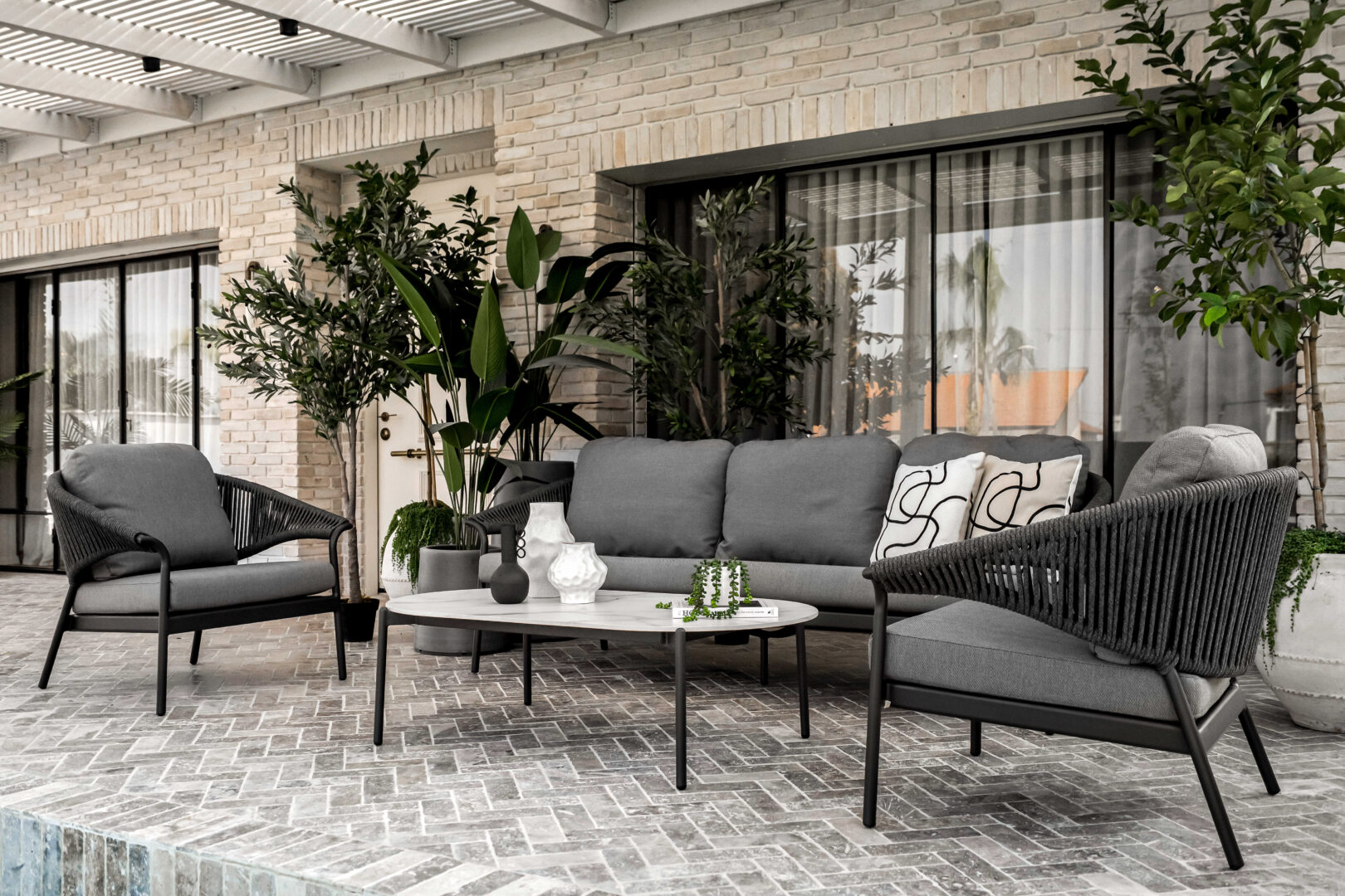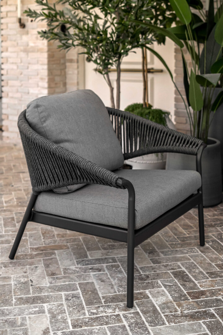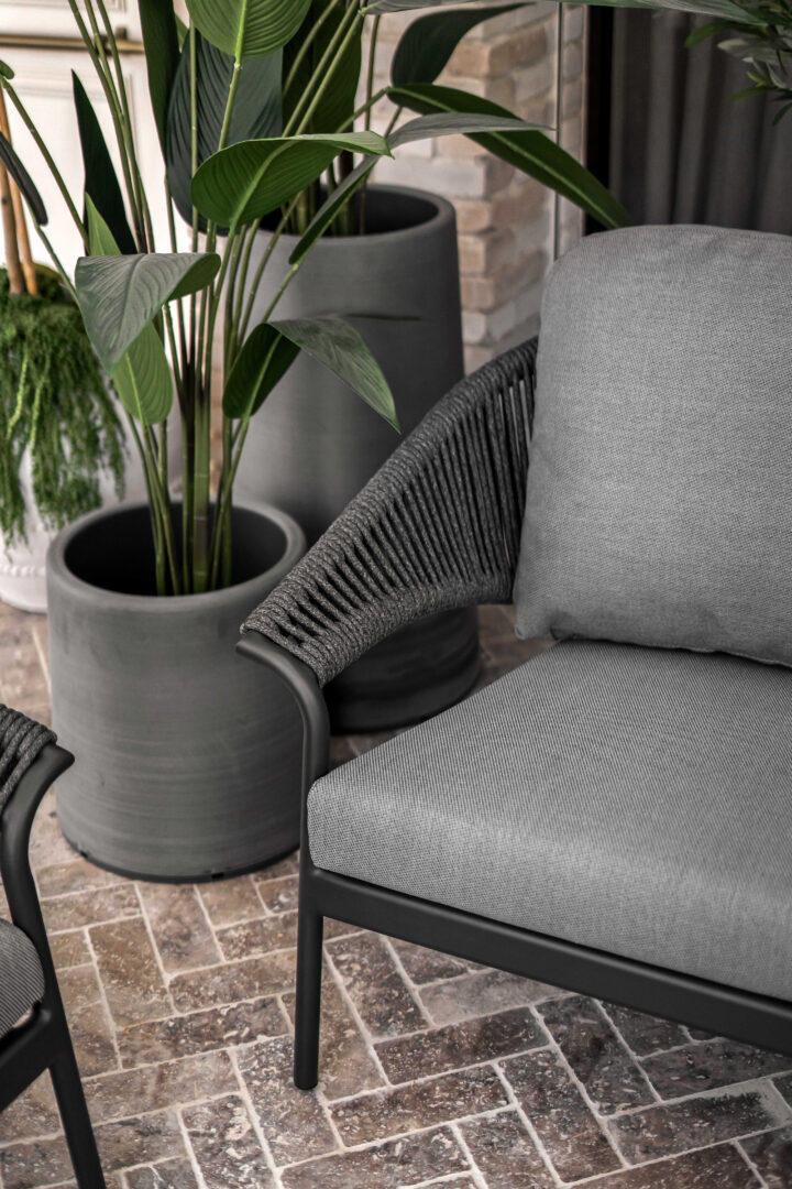 פינת ישיבה יוקרתית עשויה שלדת אלומיניום איכותית בחיפוי חבלי פוליפורפילן ובעיצוב ייחודי. המערכת כוללת ספה תלת מושבית, שני כורסאות בודדות ושולחן קפה אובלי עם פלטת גרניט פורצלן בשילוב גידים. שלדה בצבע פחם, חבלים וריפוד בגוון אפור כהה