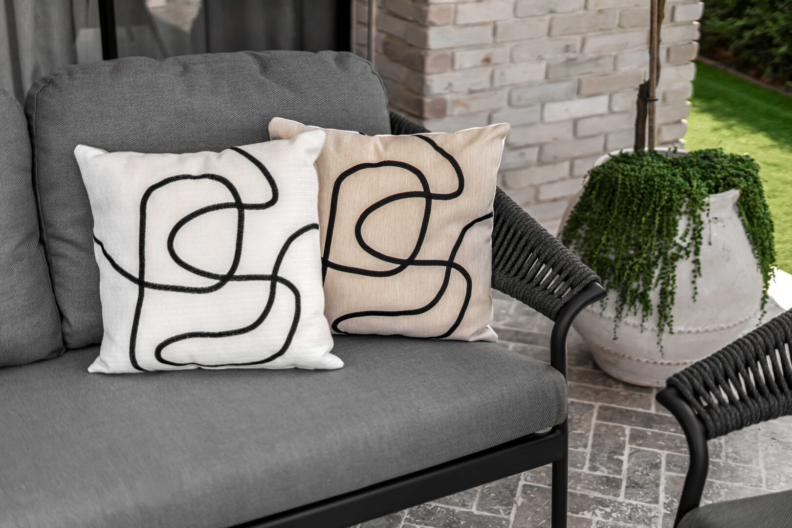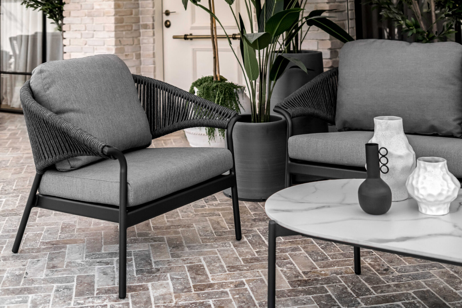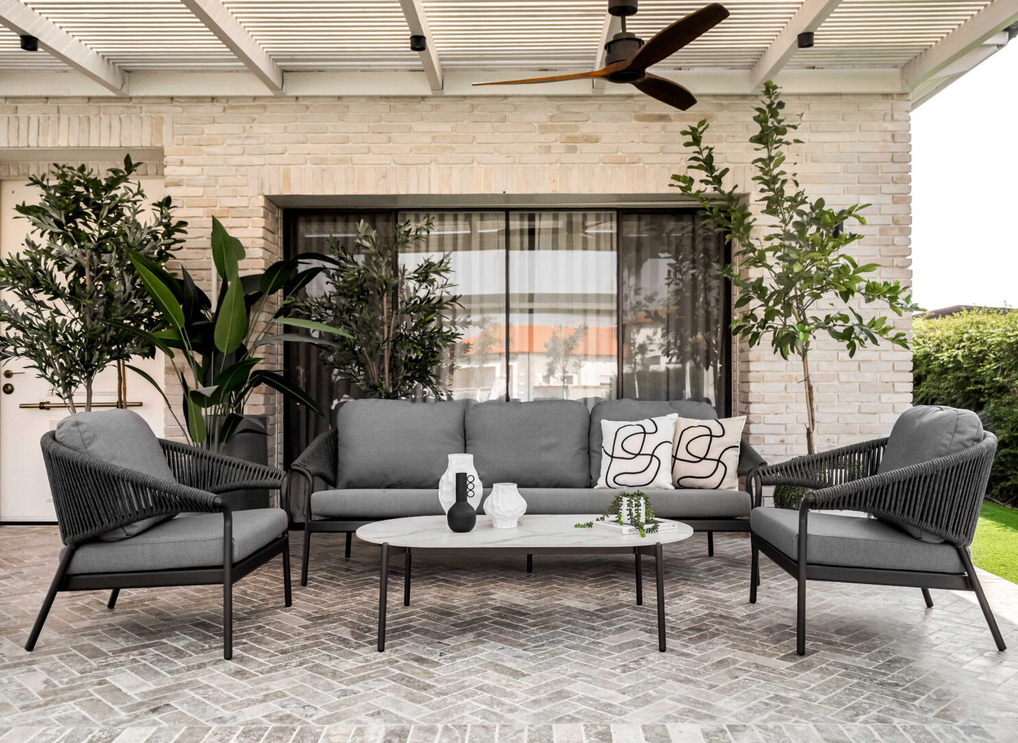 פינת ישיבה יוקרתית עשויה שלדת אלומיניום איכותית בחיפוי חבלי פוליפורפילן ובעיצוב ייחודי. המערכת כוללת ספה תלת מושבית, שני כורסאות בודדות ושולחן קפה אובלי עם פלטת גרניט פורצלן בשילוב גידים. שלדה בצבע פחם, חבלים וריפוד בגוון אפור כהה