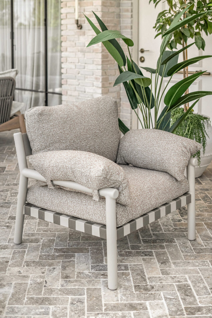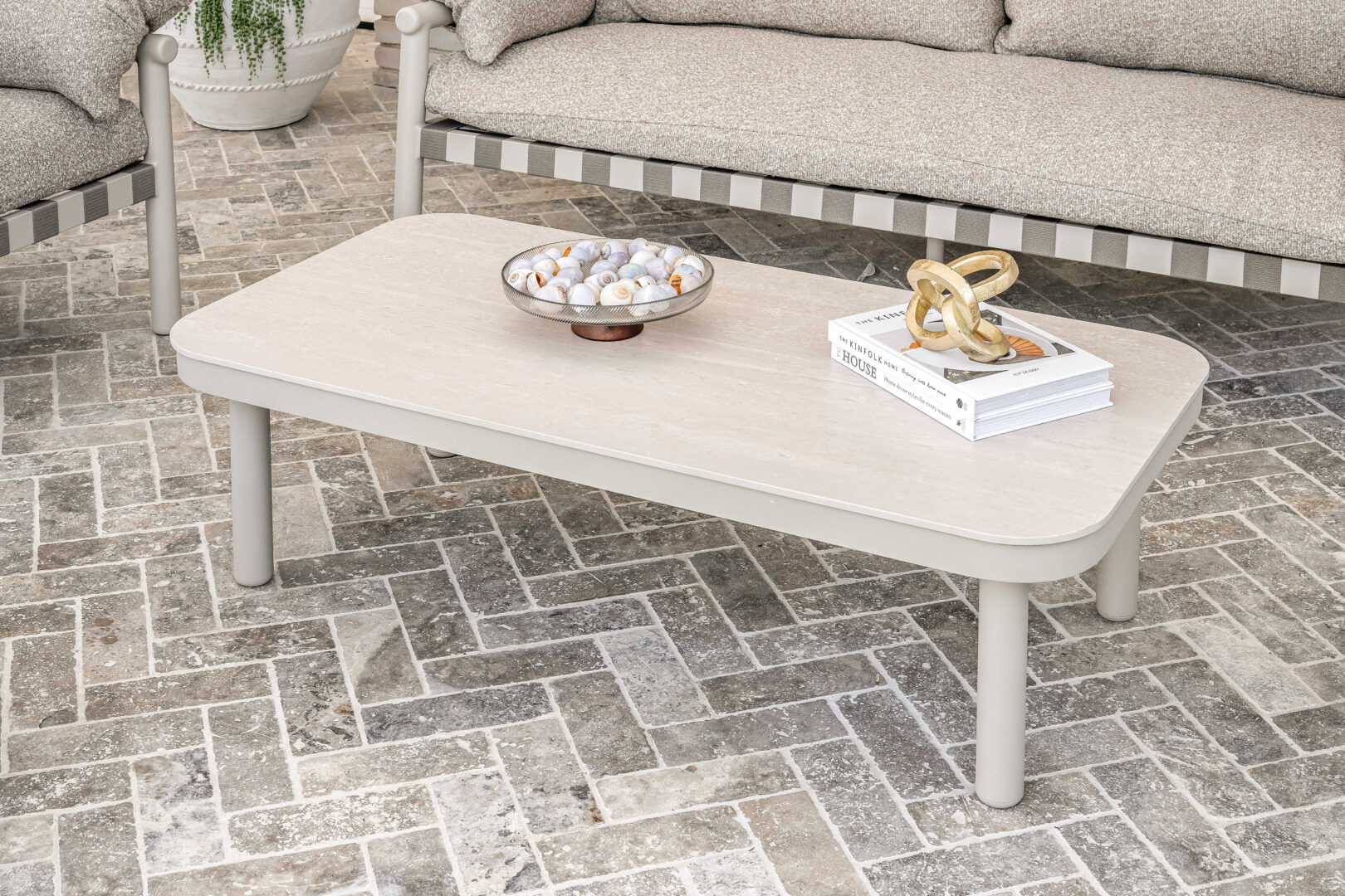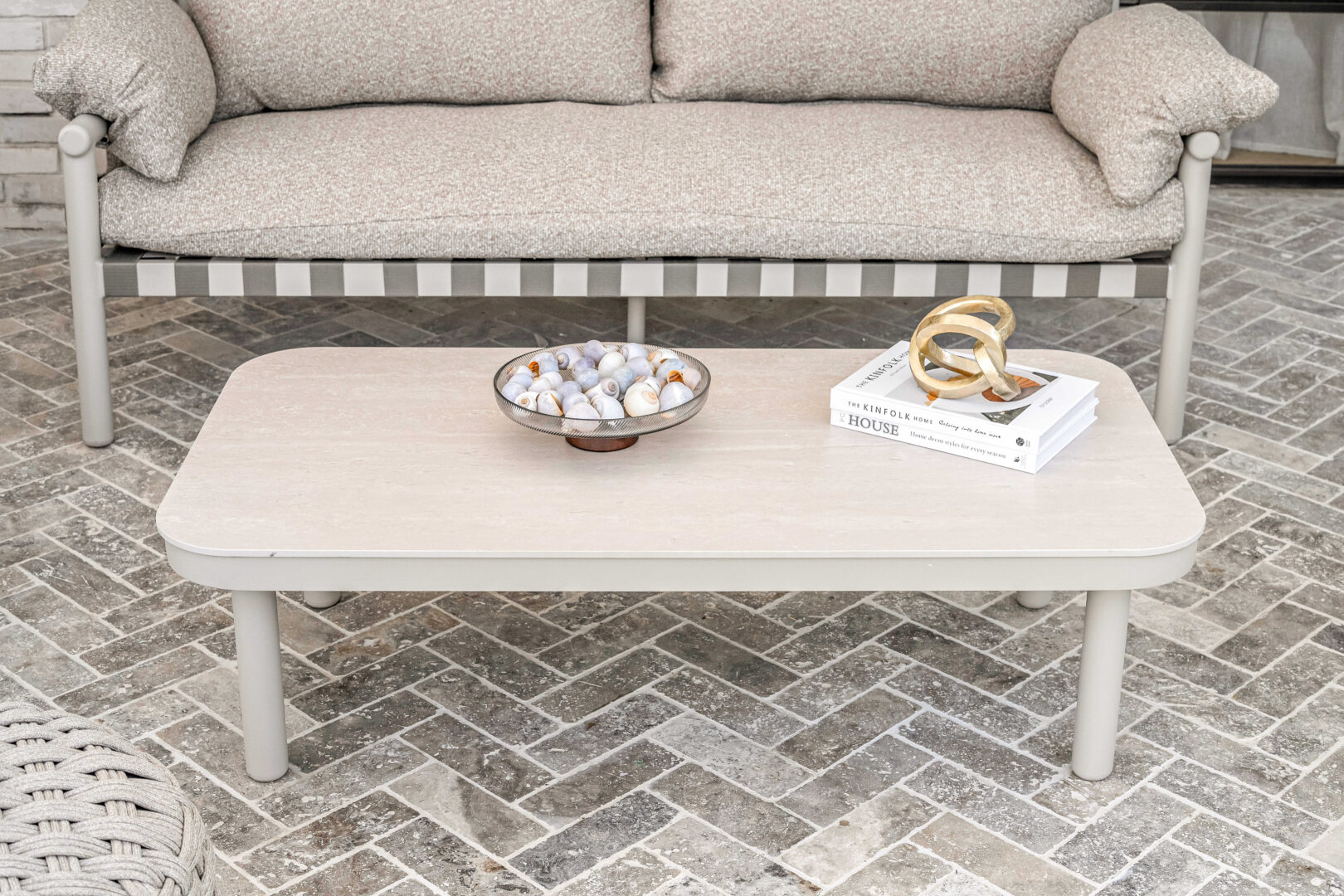 מערכת ישיבה יוקרתית במראה ייחודי, עשויה שלדת אלומיניום איכותית בשילוב רצועות חבלים עבות המלופפות סביב השלדה. המערכת כוללת ספה, 2 כורסאות בודדות ושולחן קפה עם פלטת קרמיקה טרוונטין. שלדה בצבע אבן, ריפוד בגוון מוקה. *לא כולל הדום חבלים