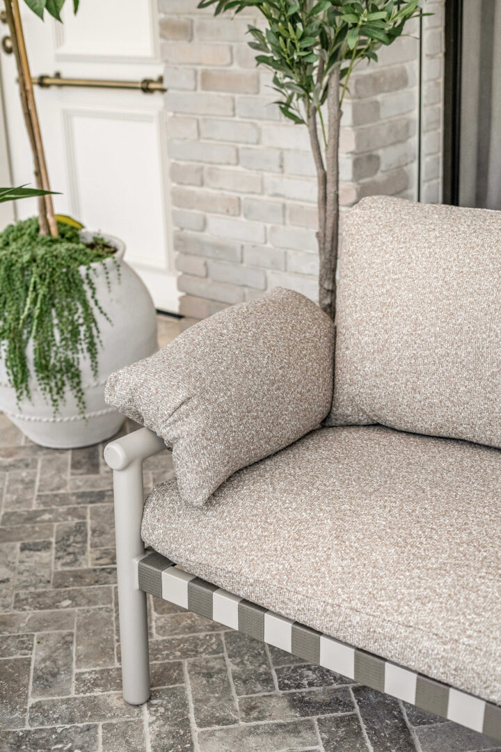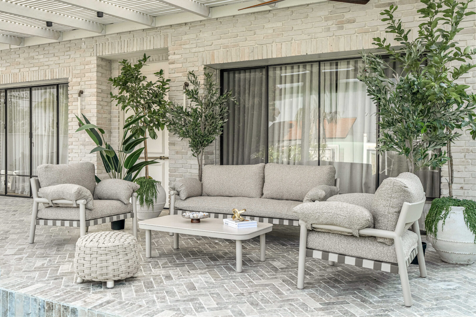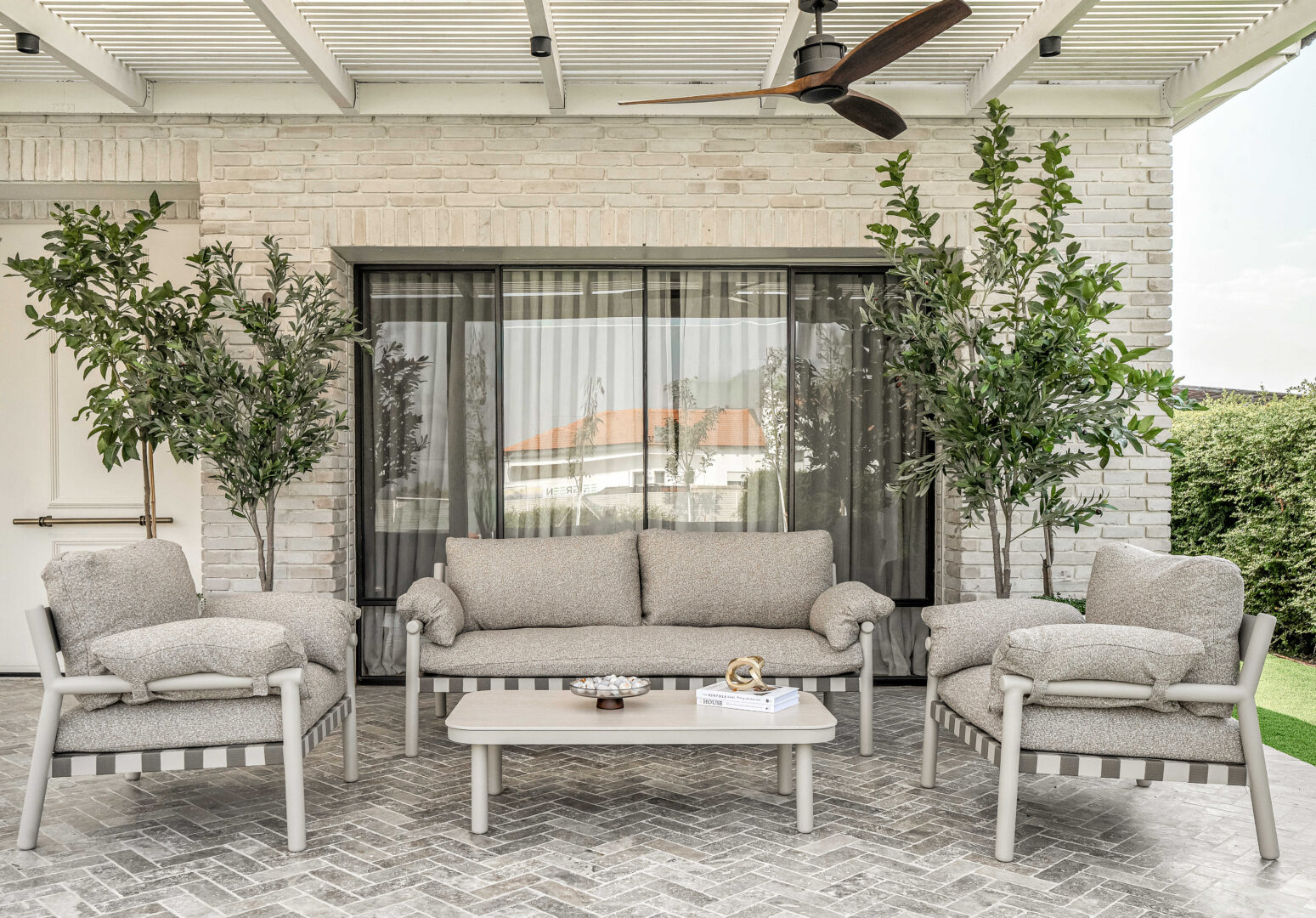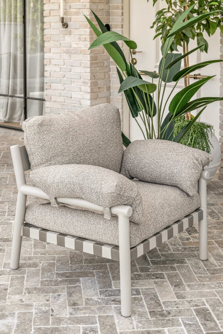 מערכת ישיבה יוקרתית במראה ייחודי, עשויה שלדת אלומיניום איכותית בשילוב רצועות חבלים עבות המלופפות סביב השלדה. המערכת כוללת ספה, 2 כורסאות בודדות ושולחן קפה עם פלטת קרמיקה טרוונטין. שלדה בצבע אבן, ריפוד בגוון מוקה. *לא כולל הדום חבלים