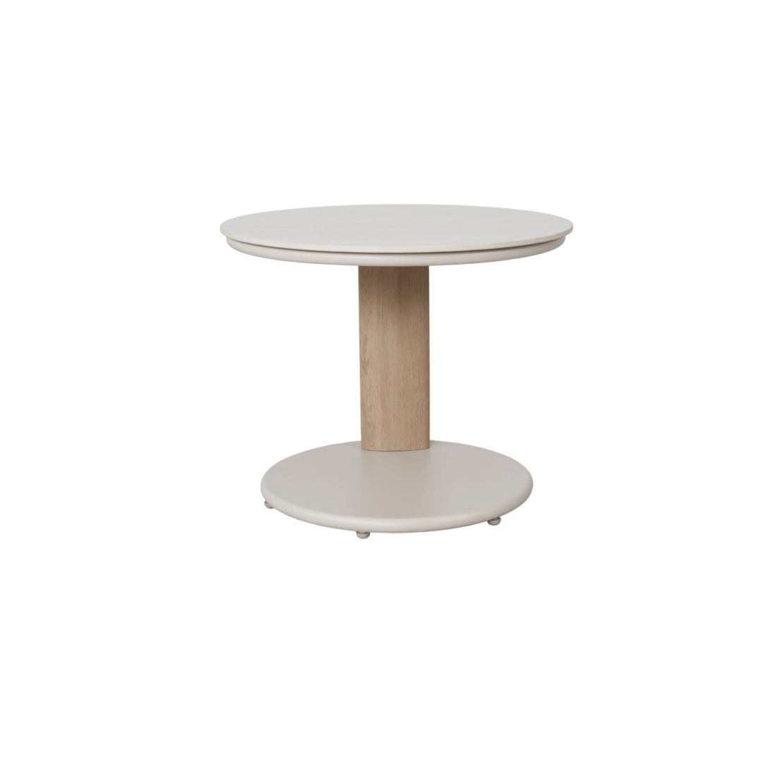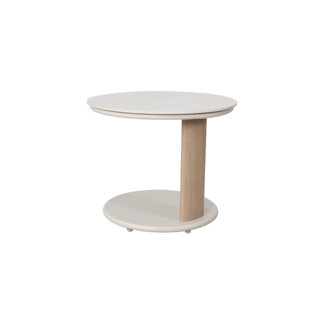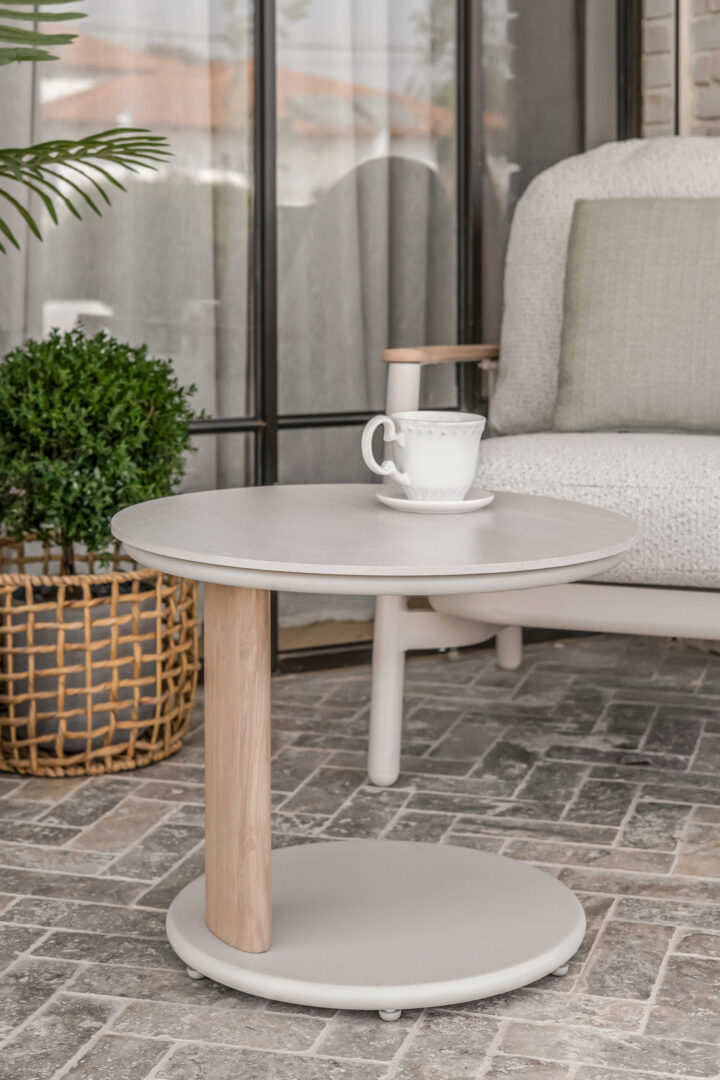 שולחן צד נשכן עשוי שלדת אלומיניום איכותית בשילוב דמוי עץ אלומיניום, ופלטת קרמיקה טרוונטין בחלק העליון